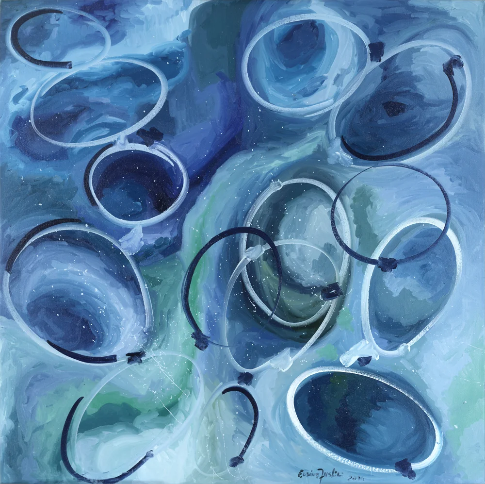 In my paintings, these consequences are expressed with nervous brush strokes that appear to have not nearly enough patience to deeply examine the impact on the canvas. Instead colour and semi-geographical shapes are evoked to create this imagined space where we are all bound to share these moments. The colours are bold and vigorously applied, free of constraint. The ovals and circles symbolise our unending dilemmas and resolve within the force of impact. The dynamism of the art work is almost imprisoned and free at the same time, connecting a reaction from my perspective to the spectator. We all need a point of reference that determines who we are, who we are about to become. In the paintings, these points are reflected in the larger dark marks connecting one oval shape to the next.